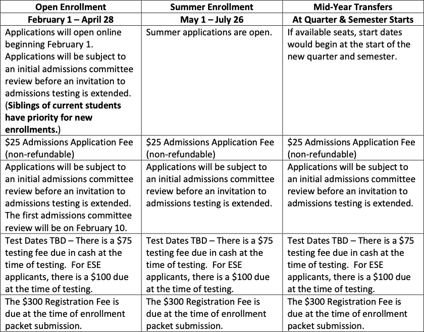 2026-2027 1st-12th Grade Applications: Applications for new students will open online on December 1, 2025, at 8:00 a.m.
