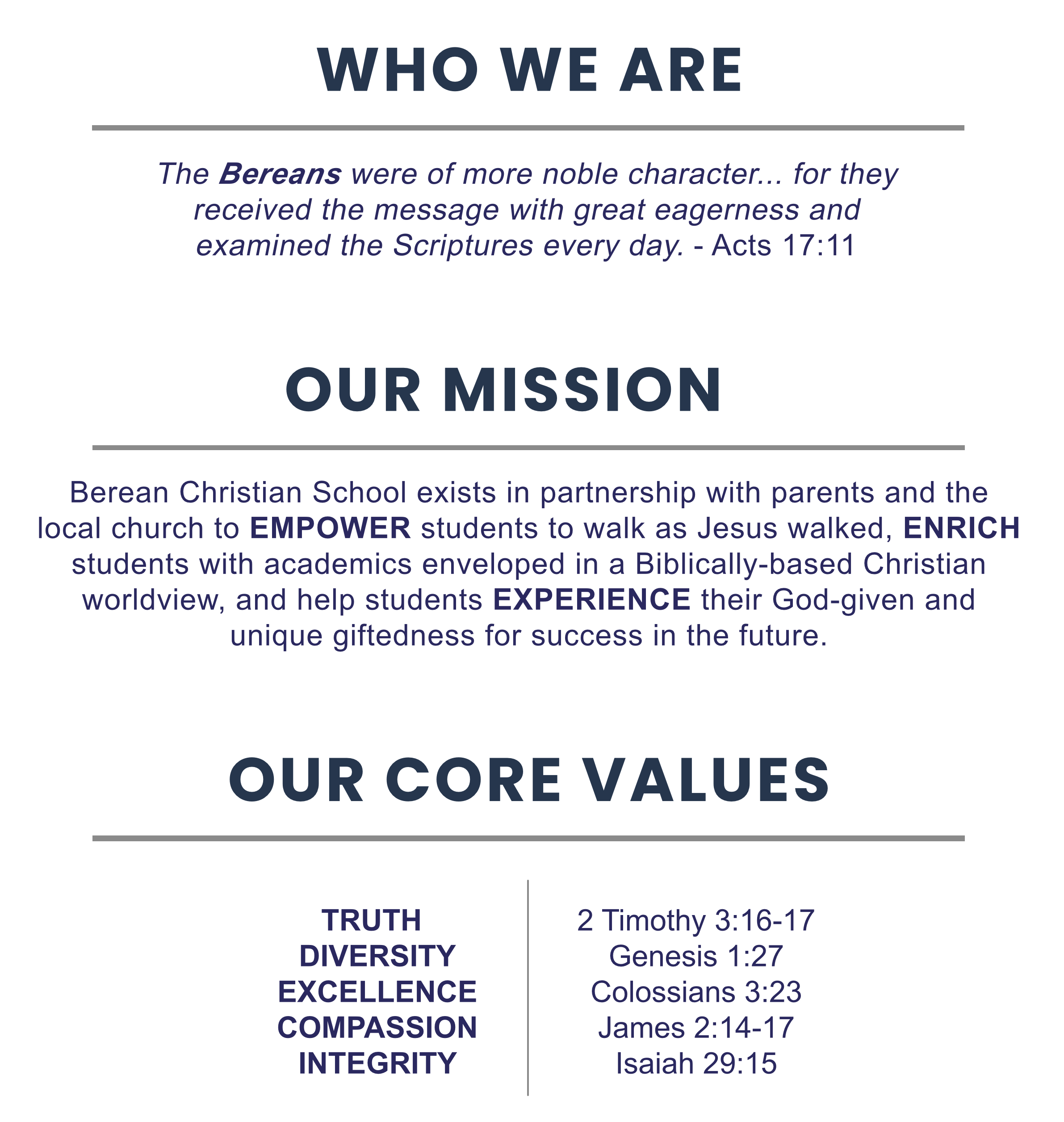 Berean Christian School exists in partnership with parents and the local church to empower students to walk as Jesus walked, enrich students with academics enveloped in a Biblically-based Christian worldview, and help students experience their God-given and unique giftedness for success in the future.